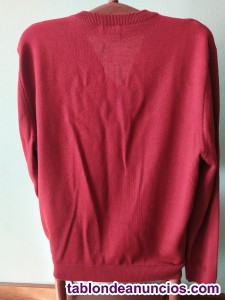 Jersey básico diseño clásico con cuello en V, en color granate. Logo discreto bordado en el pecho. Composición: 50 % lana y 50% acrílico. Marca Alber, talla 54. Medidas: ancho 60 cm x 70 cm largo. Pico 19 cm.. Venta jersey caballero de pico de segunda mano
