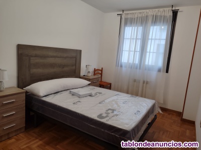 Consta de dos dormitorios, baño, salón, cocina, garaje y trastero. Está recién reformada y equipada con los electrodomésticos necesarios y el menaje que precisen; dispone de suelos de parqué (salvo cocina y baño) y calefacción y agua caliente centralizadas. Los dormitorios cuentan con armarios empotrados y camas de 135 cm.