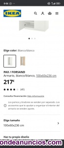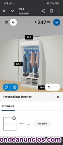 Ofrezco armario de IKEA con sólo 3 meses de uso,se vende porque tras mudanza el alto no cabe en la nueva vivienda, está completamente desmontado y organizado para recogida,color blanco con 2 cestas metallicas y sus rieles,muy buen altillo gracias a su altura,muy cómodo de montaje,su precio de compra fue de 217 euros. Medidas 100x 60x236.. Venta fantástico armario seminuevo de segunda mano
