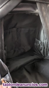 Mochila antirrobo negra y blanca de cuero, tiene 4 bolsillos laterales, dos de ellos con cremallera.