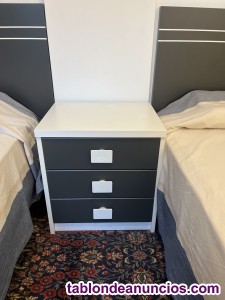 Conjunto de dos camas con cabeceros, una mesita de noche y comoda
