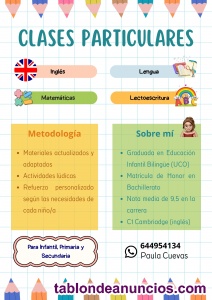 Soy Paula Cuevas, graduada en Educación Infantil Bilingüe (UCO), con C1 de inglés (Cambridge) y una nota media de 9,5 en la carrera y matrícula de honor en Bachillerato.