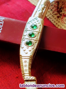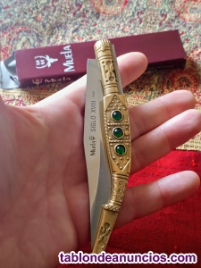 Navaja Muela, modelo ML12. Perteneciente a la serie Siglo XVIII. Latón trabajado al relieve , con incrustaciones de piedras de cristal verdes. Tamaño grande, una verdadera joya de la factoría manchega. Pieza de colección digna de vitrina. Medidas en fotografías.