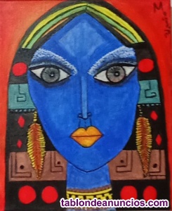 Margarita realiza esta obra sobre bastidor de madera en lienzo de 30 cx 25cm.donde nos muestra un rostro de mujer indu en color azul . Venta mujer indu de segunda mano