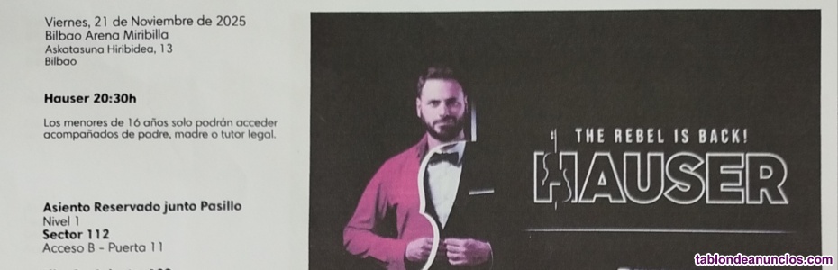Entrada Hauser 21/11/2025 Publicado 20/11/2025 en el Tablón de Anuncios de Bilbao 45 € Se vende 1 Entrada para el concierto de Hauser al 50% del precio de compra. Sector 112, fila 9, asiento junto a pasillo. Vistas Nítidas. Está publicada en viagogo y puedo enviar enlace de ticket máster para seguridad el comprar. Contactar Enviar