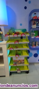 Mueble expositor estantería metálica con 7 baldas sencillas y una con dos niveles, y con ruedas.