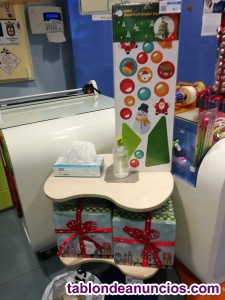 Módulo de envolver con ruedas con freno lacado en blanco completo, con portarrollos, guillotina de corte de alta calidad, y huecos ideales para organizar las bolsas, sobres regalo..., presentar y envolver los productos cómodamente, y poder dar un valor añadido a tus ventas.