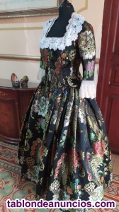 Vendo traje de fallera fondo negro con estampados dorados y colores vistosos usado solo un día talla 38 cosido por un modisto con zapatos forrados de la misma tela talla 39. Venta traje de fallera de segunda mano