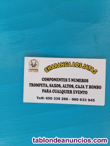 Somos una charanga muy muy pequeña pero nos adaptamos tanto a tu presupuesto k es asequible y hacemos para todos los ambientes mezclado de todo y para cualquier evento solo es probar saberse divertir y lo comprobarás nombre los jatas con su patrimonio de muchos y muchos años rodando en escenarios ahora mismo ya hacemos charanga componemos saxos y caja y bombo y voz cantando también