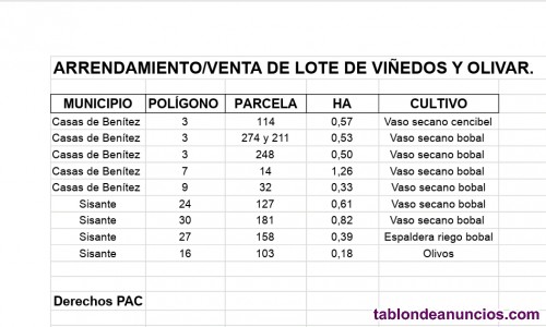 Venta o rento de 5,17 hectáreas de viñedos y olivos en Casas de Benítez y Sisante. Con derechos PAC. El lote incluye: Viña en espaldera con riego por goteo, variedad bobal, plantada en 2021 (0,39 hectáreas). Viña de vaso, secano, tempranillo, plantada en 2005. Varias parcelas de viña de vaso, secano, variedad bobal (referencias SIGPAC en las fotografías del anuncio) 21 olivos. Requisitos: disponer de tractor propio, arados... Ser viticultor/a, joven agricultor/a, mujer rural agricultora, empresa agrícola, bodega... Asumir todas las labores de las viñas: poda, labrar, abonar, tratamientos fitosanitarios, vendimia. No se exige renta fija. No se ofrece alojamiento, ni lugar donde guardar el tractor...