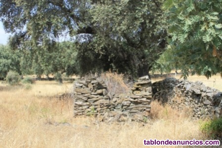 Parcela amurallada con piedra, con encinas, pastos, charca y antigua construcción. 10.456 M2. Acceso por camino a 1 km de la carretera.