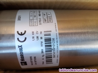Vendo bomba sumergibles 1,5 cv de dos cuerpos de la marca hidrobex para pozos profundos. Me costó 576€ y la vendo por 250€, nueva sin estrenar. Características electrobomba hidrobex El motor sumergible es coverco 1,5 cv 4" 230v monofásico, realizado con materiales de primera calidad para garantizar una larga duración y funcionalidad, incluso bajo las más duras condiciones de trabajo. Sus usos pueden ser muy diversos: instalaciones de riego, suministro de agua potable, montaje en pozos profundos. · potrencia 1,5 cv - 1,1 kw. Amp 230v-1 10,4. Diámetro 102 mm. Longitud 1008 mm. · peso 14 kg.· caudal máximo 6 m3/h.· altura máxima 106 metros.· carcasa exterior aceroinoxidable aisi 304. Encapsulado motor acero inoxidable aisi 304.· rodetes pom. · difusores pom.· soportes aspiración e impulsión latón.· rejilla aspiración acero inoxidable aisi 304.· eje motor acero inoxidable aisi 304.· condensador externo.· cable alimentación ho7rn-f 4x2,5.
