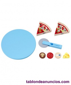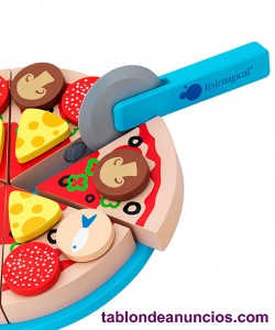 Pizza de madera en 6 porciones, con base, cortador y 24 ingredientes sueltos para colocar como uno quiera. ¿Jugamos a las comiditas?
