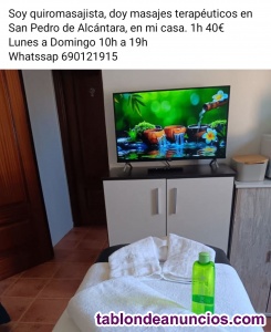 Doy masajes terapéuticos Publicado hoy 08:36 en el Tablón de Anuncios de Marbella 40 € Hola, Soy chica quiromasajista. Doy masajes terapéuticos descontracturante y relajante en camilla, 40e 1h. En mi casa en San Pedro de Alcántara. Lunes a Domingo 10h a 19h. Citas y ubicación whatssap. Contactar Enviar