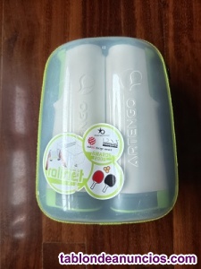 Set de tenis de mesa que incluye dos raquetas, red ajustable y tres pelotas, todo guardado en una práctica funda.