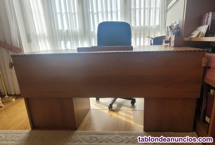 Preciosa mesa color cerezo, con ala, cajonera y puerta. Largo: 1,60cm. Ancho 52cm (zona estrecha) y en zona del ala:97cm. Altura: 75cm. Tiene frontal y se ha personalizado de forma elegante, poniendo un cordón en su perímetro (puede quitarse si lo prefieres). En el interior de la puerta hay una balda, lo que permite tener 2 huecos para guardar lo que necesites y en la parte superior hay un cajón, por lo que tiene gran capacidad, sin excesivo volumen. También puedes incorporar la mexa auxiliar para impresora (incluida en el precio de este anuncio) y, si compras también las 2 sillas de confidentes que ves en las fotos (también publicitadas en otro de mis anuncios), se puede negociar el precio global. Todo está prácticamente nuevo, es de calidad y el conjunto tiene un toque distinguido. Ideal, para una habitación pequeña. La mesa Auxiliar es madera y cristal (con ruedas): 52 largo x 41 fondo y 69 alto. 3 estantes.