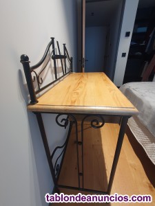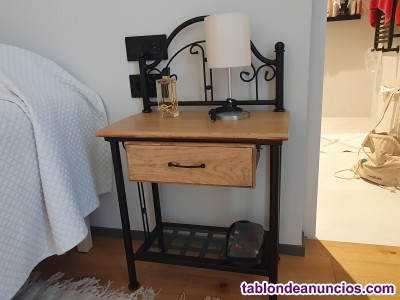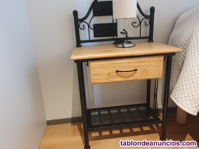Cómoda y mesitas de noche de madera en color natural y forja.