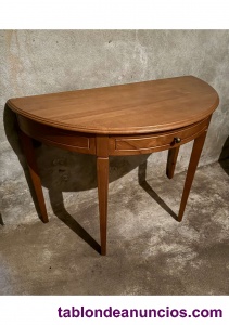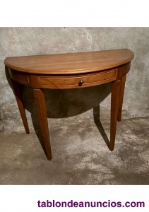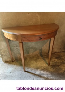 Consola media luna (103x50x76) con 1 cajón, macizo en madera de haya color cerezo medio. Fabricante nacional. Artículo de exposición totalmente nuevo procedente de cierre de tienda de muebles. Tiene dos pequeños arañazo en la tapa. Precio en tienda 390€. Precio liquidación 250€. Ahora solo 180€.. Venta consola media luna de segunda mano