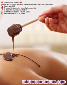 Tenemos el mejor Regalo de San Valentin para ti o para alguien especial . Nuestro masaje de chocolate-una bomba de sensaciones inolvidables. Desde solo 25€. Zona Avenida de América Somos tu promesa de Salud ,Belleza y Bienestar.Llama ua al 677 509 554 y reserva tu cita-todos los días de 8h a 20h con cita previa. FisioesteticaCuerpoSano