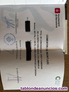Se ofrece cesión del derecho de uso a perpetuidad de un nicho ubicado en el Cementerio de Montjuic (Barcelona). Ubicación: Columbario B., Piso 3, Numero 807, Plaza Nuestra Sra. Del Carmen, Agrupación 14. Documentación oficial en regla. Transferencia disponible de forma inmediata. Trámite oficial a través de Cementiris de Barcelona, cumpliendo con los requisitos legales. Compensación económica orientativa: 12.000 € (negociable) Contacto por mensaje privado para más información. Solo personas serias. Gracias.