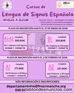 Curso online de lengua de signos española Publicado hoy 17:36 en el Tablón de Anuncios de Albacete Precio a convenir ¡Aprende Lengua de Signos Española desde casa! Cursos completos: A1, A2, A1+A2 y B1 100% online + horario flexible Homologados dentro del Marco Europeo de las Lenguas - Contactar Enviar