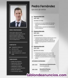 Te ayudo a crear/mejorar tu currículum vitae Publicado 02/11/2025 en el Tablón de Anuncios de Madrid 5 € Hola, Relizo currículums profesionales. Por tan solo 5€ puedo ayudarte a crear tu currículum profesional desde cero. Si el CV no destaca, no servirá de nada. ¡No pierdas tiempo con un CV que no destaque! Escríbeme sin compromiso. Contactar Enviar