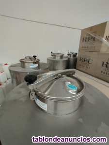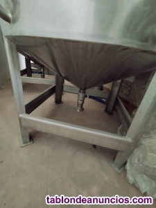Lote de 7 depósitos fabricados en inoxidable. Volumen de 200 litros cada uno. Con boca de hombre superior, nivel exterior, salida inferior centrada, válvula de salida inferior lateral. Montado sobre estructura de 4 patas.