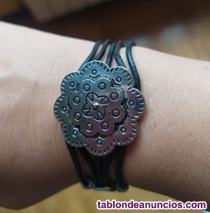 Pulsera de cuero negro con diseño central en forma de flor, adornos circulares con diseño de estrella en los laterales y múltiples tiras de cuero negro entrelazadas. Medida: 18 cm.. Venta pulsera cuero negro y adornos metalicos de segunda mano