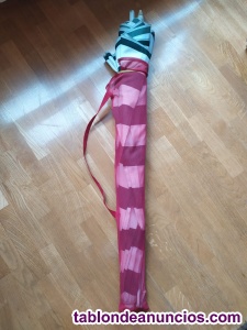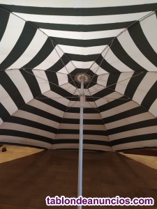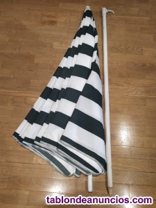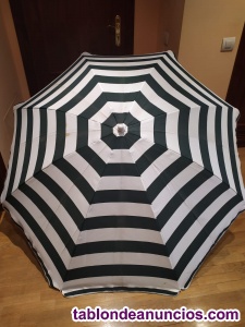 Sombrilla con un diseño de rayas verde botella y blancas con 8 varillas para mayor estabilidad. Tiene alguna mancha pequeña de humedad. Medidas: 1,62 cm abierta; altura máxima 1,90 cm.. Venta sombrilla de rayas con 8 varillas de segunda mano