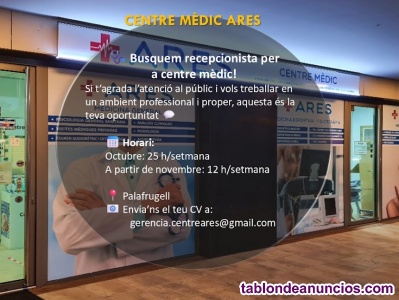 Busquem una persona responsable, amable i amb bones habilitats de comunicació per incorporar-se com a recepcionista al nostre centre mèdic.