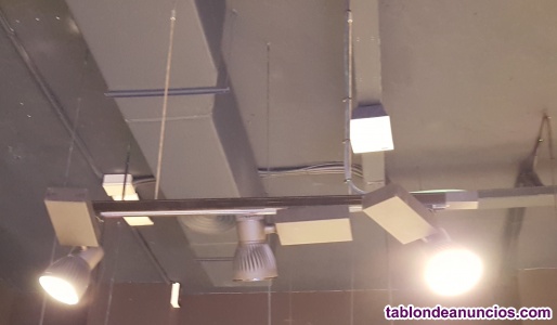 Se vende iluminación completa compuesta por conjunto de 54 proyectores LED y carriles electrificados negros y resto de accesorios de colocación (empalmes, terminales y varillas roscadas para fijación a techo) en perfecto estado. - Diseño moderno y funcional. - Fabricados en metal resistente.