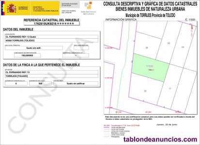 Terreno urbanizable para edificar vivienda unifamiliar ubicado en la Calle Fernando Rey, 13 de Torrijos (Toledo), de 295 m2 en parcela, con 12,5 m de fachada y 24 m de fondo aproximado. Se puede construir vivienda pareada o libre, con posibilidad de edificar dos plantas y semi-sótano, altura máxima 6, 5 m. Según normativa municipal, listo para pedir licencia. Parcela con servicios de alumbrados públicos, alcantarillados, abastecimiento de agua, vía publicas. También dispone de servicios cercanos como parque infantil con jardines, parque que patinaje, polideportivo municipal, centros comerciales, centros escolares desde infantil hasta la BAU, centro de salud con Urgencias, zonas verdes para familias y animales domésticos, edificios religiosos, aparcamientos público de vehículos y camiones, etc. Esta población dispone de todos los servicios necesarios para atender a más de 19.000 habitantes, y 89.000 habitantes flotantes de poblaciones colindantes, dispone de Estación de Ferrocarril a 30 minutos de Madrid-Atocha, Estaciones de Autobuses Príncipe Pio y muy buena conexión con autovías A42 - A40 que comunica con la capital de España - MADRID en 40 minutos.